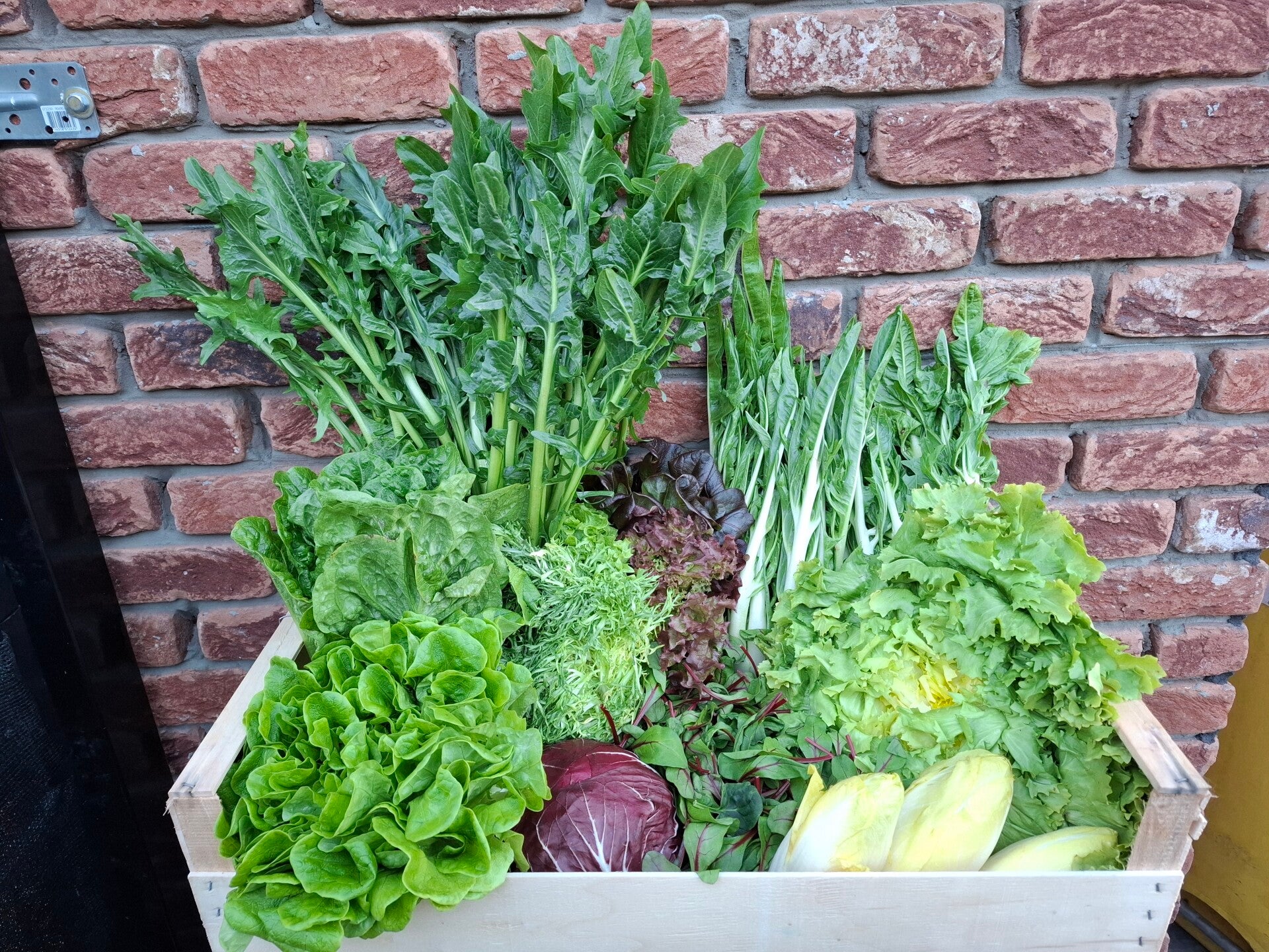 1 kg catalonga(paardenbloemsla), 1kg cimata, 1kg rapini, 0.5kg witloof, 1 andijvie, 1 krulandijvie, 1 romana/romeinse sla, 1 radicchio, 1 eikenbladsla groen, 1 frisee mix, 125 gram rode bietenbladjes.